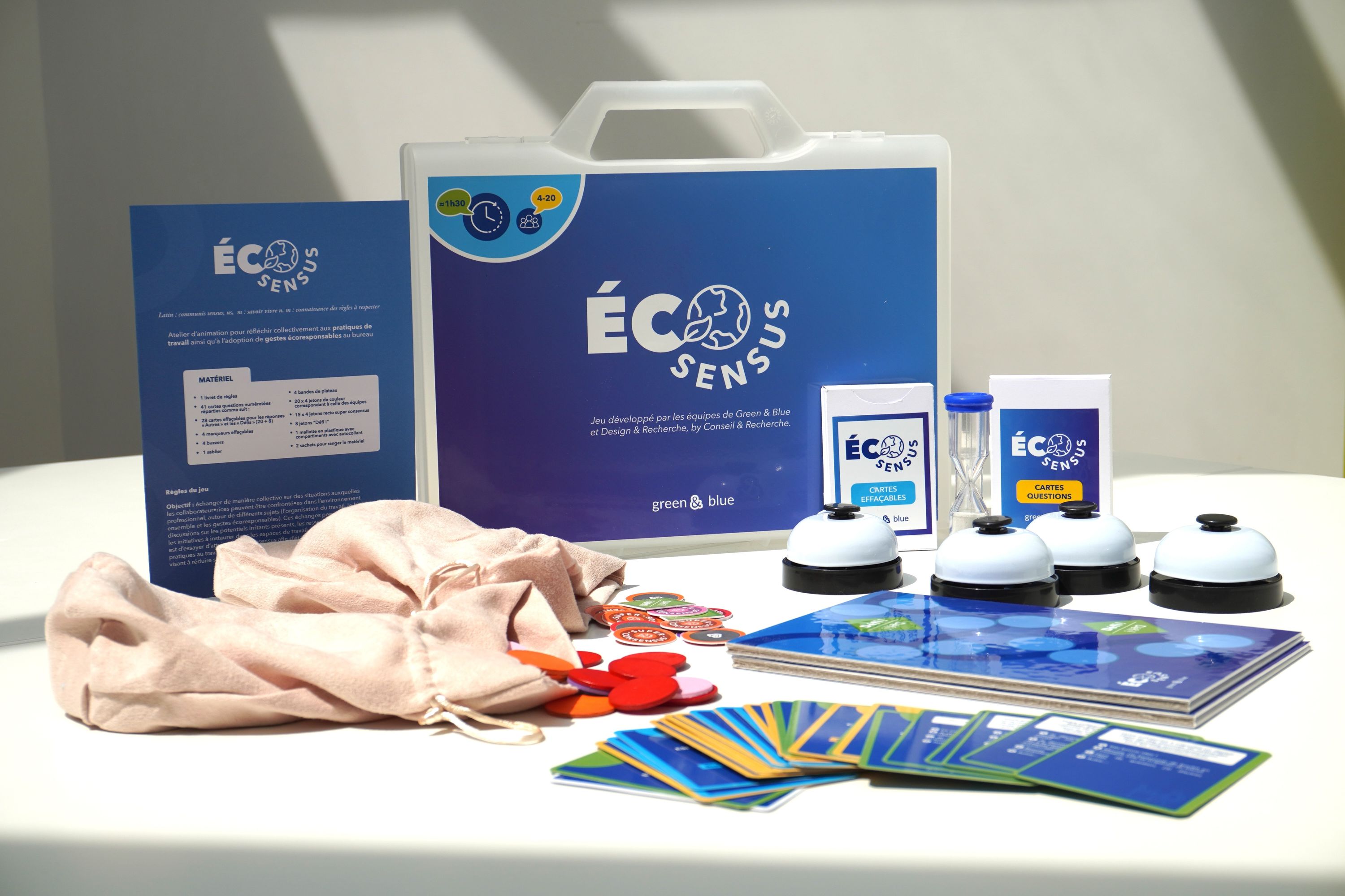 Éco-Sensus | A valider | Sociétés | green & blue ; design & recherche | Échanger de manière ludique et collective sur des situations auxquelles les collaborateur•rices peuvent être confronté•es dans l’environnement professionnel, autour de différents sujets (l’organisation du travail, le bien vivre ensemble et les gestes écoresponsables). Ces échanges permettront d’ouvrir les discussions sur les potentiels irritants présents, les ressentis de chacun ainsi que les initiatives à instaurer dans les espaces de travail. L’objectif de ces échanges est d’essayer d’atteindre des consensus afin d'établir une charte des bonnes pratiques au travail, composé de bons réflexes à adopter et de défis d’équipe visant à réduire son empreinte carbone au travail. | Dec 17, 2025 9:21 AM | 1h30 | De 4 à 20 joueur·se·s | Non | Jeu de plateau / Jeu de cartes | PrestationSur contact | La Rochelle | Dec 17, 2025 9:21 AM | |||||||||||||